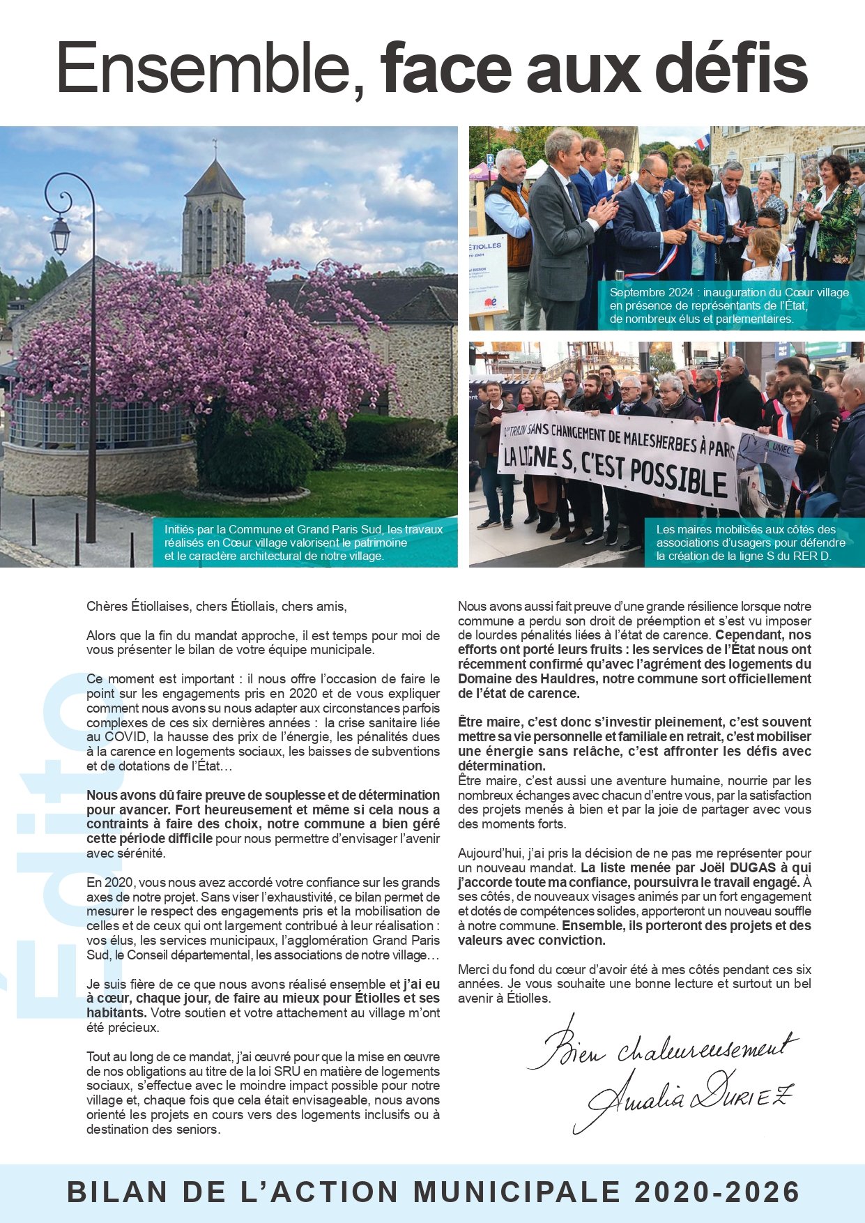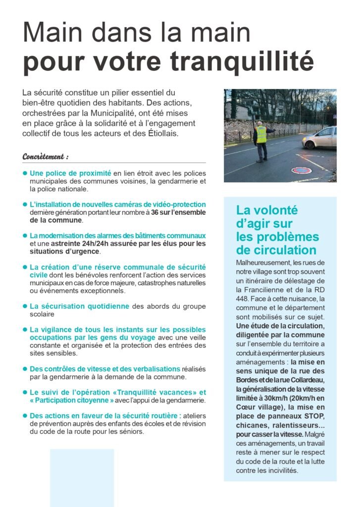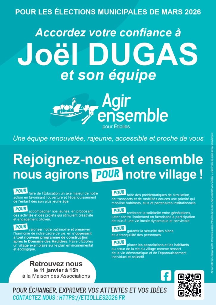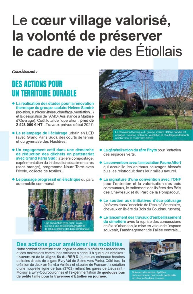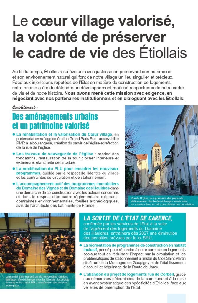 Ces dernières semaines, nous avons distribué dans l’ensemble des boîtes aux lettres d’Étiolles un document présentant le bilan de l’action municipale 2020–2026, ainsi que les ambitions que nous portons pour les années à venir.