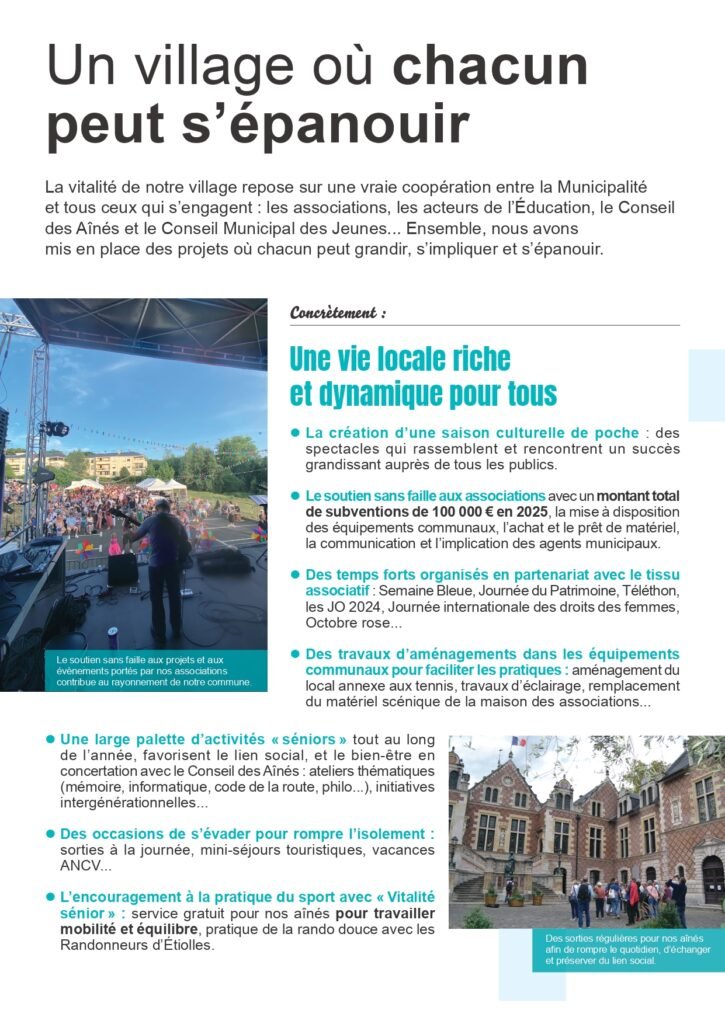 Au-delà du bilan, ce document trace aussi des perspectives claires pour le prochain mandat. Il s’inscrit dans une logique de continuité, avec la volonté de poursuivre ce qui fonctionne, d’améliorer ce qui doit l’être et de préparer l’avenir avec une équipe renouvelée, engagée et proche des habitants.
