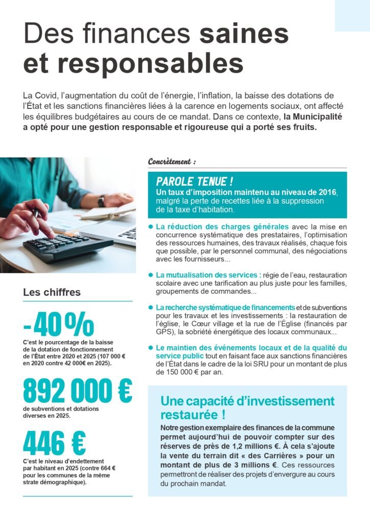 Ce document revient de manière structurée sur les grands axes qui ont guidé l’action municipale. Il aborde notamment la préservation du cadre de vie et la valorisation du cœur de village, une approche maîtrisée de l’urbanisme, l’école et la jeunesse, placées au cœur des priorités, le soutien à la vie associative et aux solidarités, ainsi que la sécurité et la tranquillité du quotidien. Il consacre également une place importante à la gestion financière de la commune, qui a permis de restaurer des marges de manœuvre et d’envisager l’avenir avec plus de sérénité.