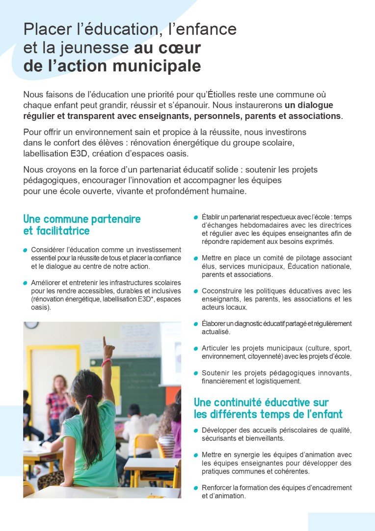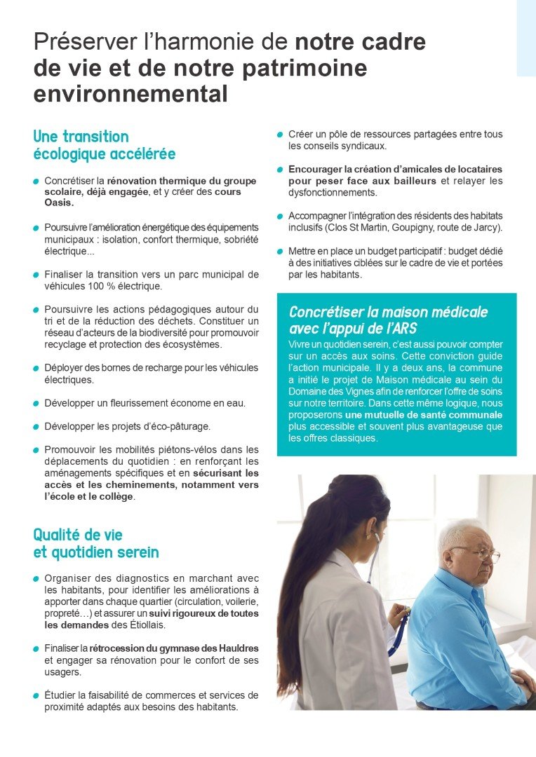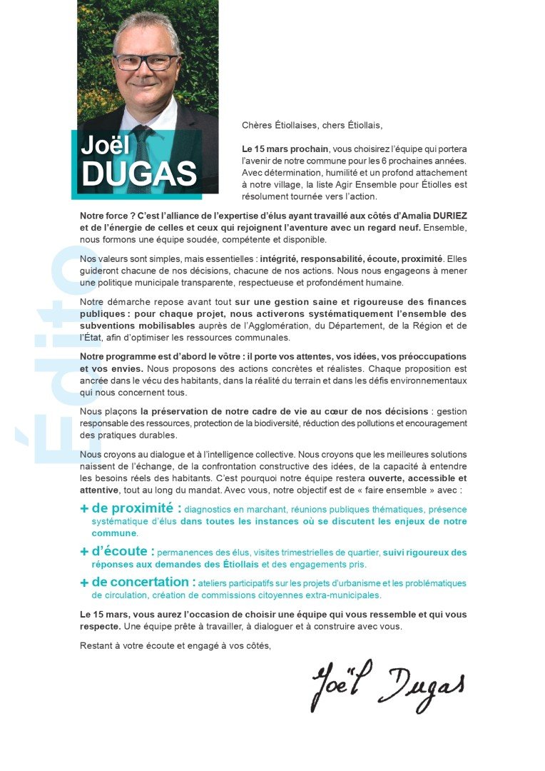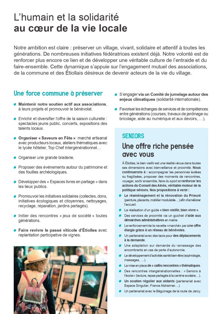 Ce programme n’est pas le fruit d’un travail en chambre. Il est le résultat de nombreux échanges, de rencontres riches et sincères avec les Étiollaises et les Étiollais. Vos remarques, vos attentes, vos inquiétudes et vos propositions ont nourri notre réflexion.