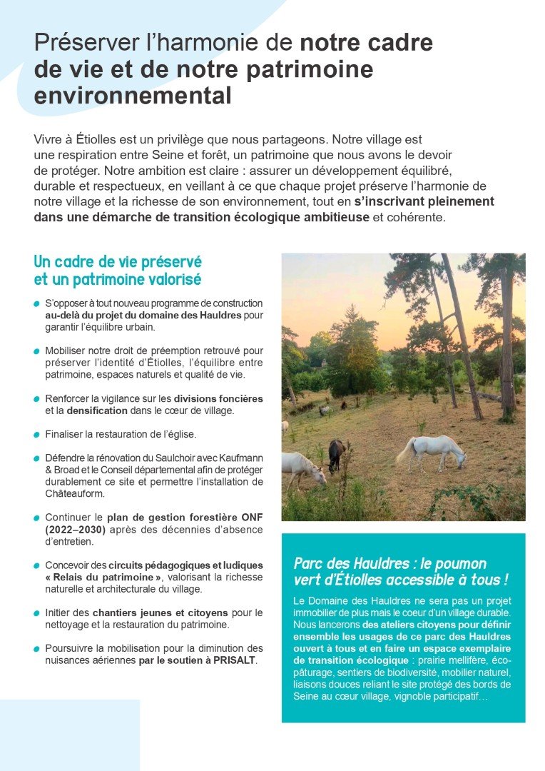 Notre engagement : défendre l’identité d’Étiolles et garantir un développement équilibré.